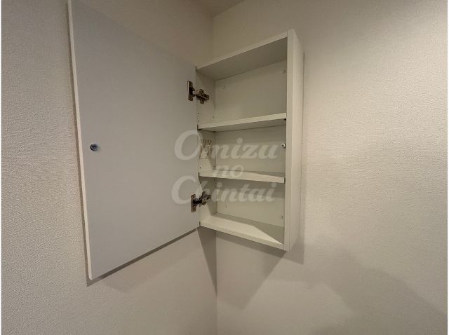 トイレの上部にも扉付きの棚があり、トイレットペーパーの予備や掃除用品などを隠して収納でき、すっきりとした空間を維持できます 。