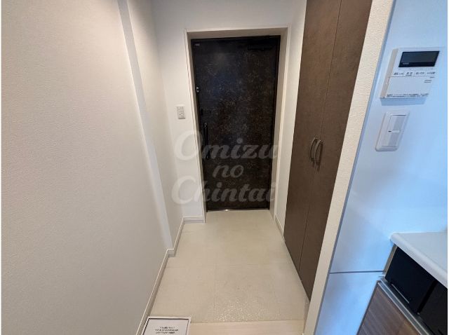 玄関扉はダークブラウンで重厚感があり、壁はホワイトのクロス、床は明るい色のタイルで統一されており、清潔感あふれる玄関です。
