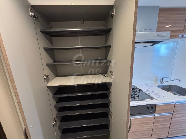 上部収納には、調味料や食器を収納できる扉付きの棚があり、キッチン周りをすっきりと保てます 。