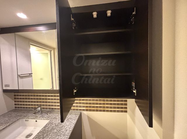パウダールームを常に美しく保つ壁面収納付きで、サニタリー用品のストックやリネン類をまとめて収納できる便利なスペースです。