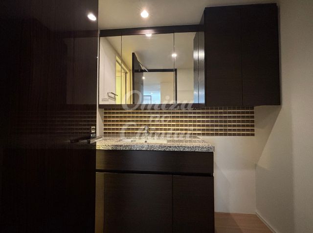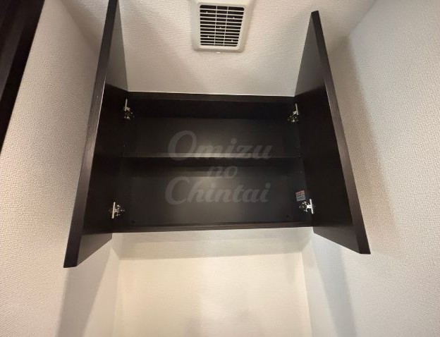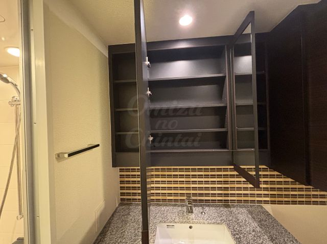 洗面台下や鏡上部のキャビネットは、玄関と同じくダークブラウンの木目調で統一されており、落ち着いた雰囲気です。