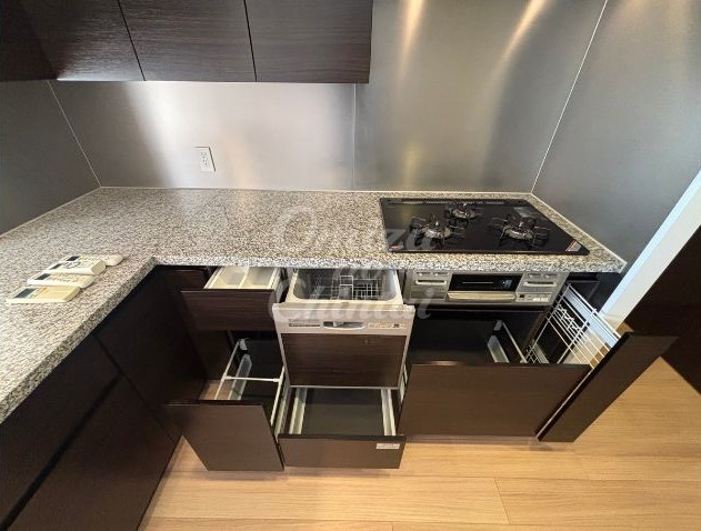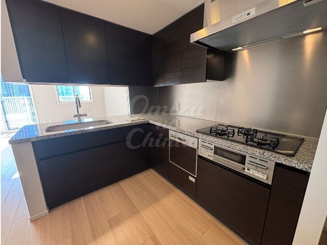 広い作業スペースを確保できるL字型キッチンで、シンク・コンロ・冷蔵庫の間の移動がスムーズに行え、複数人での料理も快適にできます。