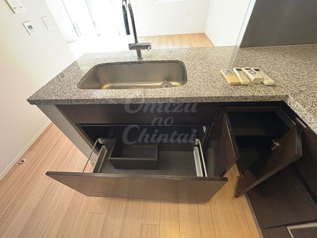 食洗機の脇や下部にも引き出しやワイヤーラックが組み込まれており、デッドスペースを極力排除し、細かな調味料や小物、ラップ類なども収納可能です。