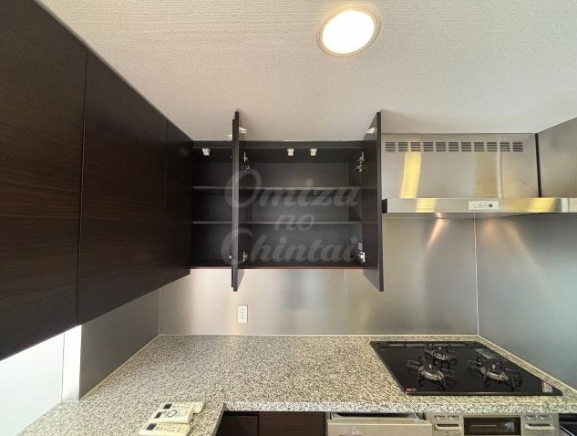 コンロ上部の高い位置にある吊り戸棚は、使用頻度の低いものやストック、乾物などを収納するのに最適です。