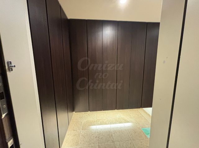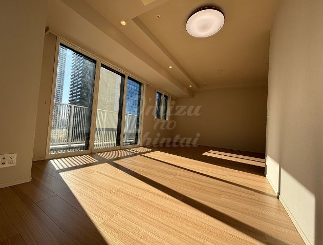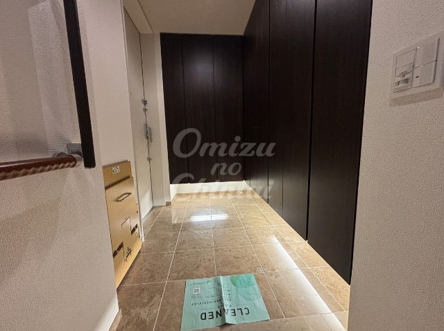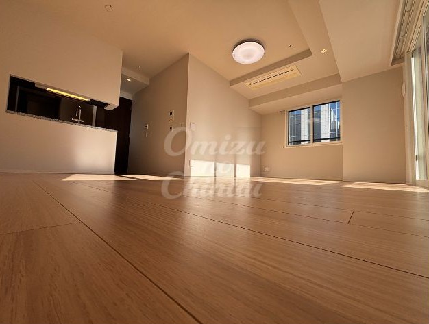 ベージュ系の光沢のあるタイル調フロアが採用されており、明るさと清潔感を保ちながら、住戸に入った瞬間に上質なタワーマンションの雰囲気を感じさせます。