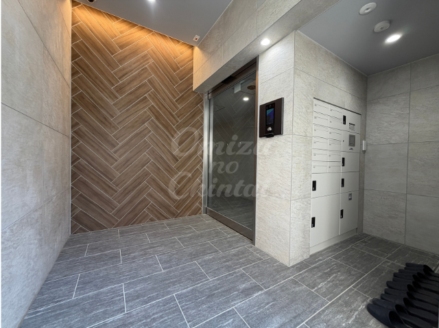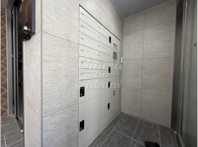 エントランスの洗練された壁面に、メールボックスと宅配ボックスが設置され、突出を抑えたフラットな仕上がりが、上質な共用空間を演出します。