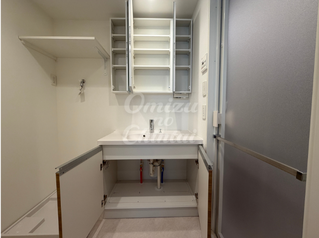 鏡の裏には細かな化粧品やスキンケア用品を整理できる棚を備えており、生活感を隠してスッキリ保てます。