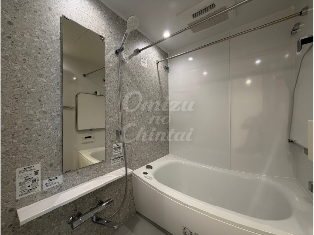 高級感のあるグレーの石目調アクセントパネルを採用し、一日の疲れを癒やすのにふさわしい落ち着いたバスルーム。