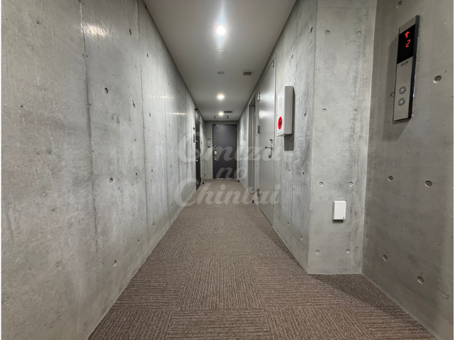 オートロックを抜けると、外観の意匠を継承した打ち放しコンクリートの質感が美しい、洗練された共用空間が広がります。