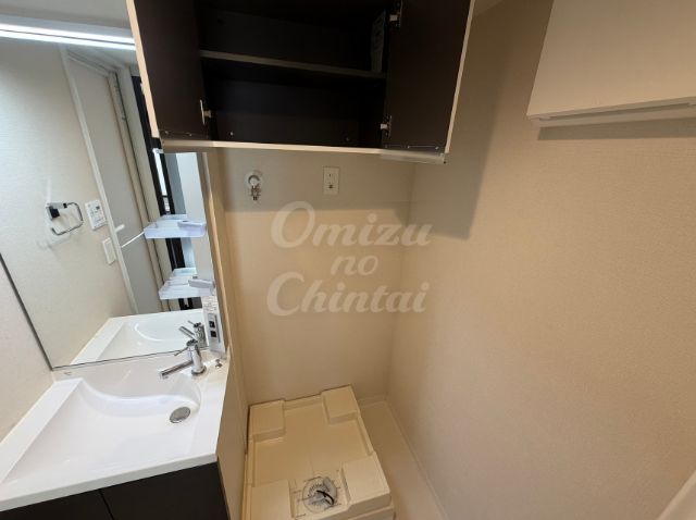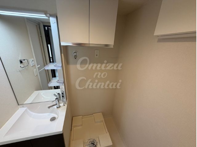 洗濯機置場の上部には、デッドスペースを活かした便利な吊戸棚を設置され、洗剤のストックや洗濯ネット、ハンガーなどのランドリー用品をすっきりと隠して収納。