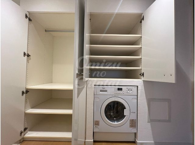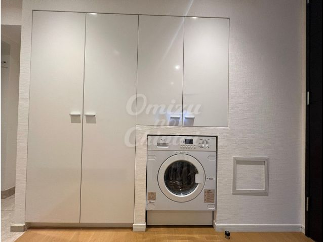 洗濯機上部や隣接する壁面には、天井まで届く大容量の収納戸棚を配置。