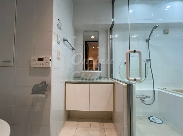 視覚的な広がりが生まれ、バスルーム特有の閉塞感を一切感じさせない、ホテルライクで贅沢な空間に仕上がっています。