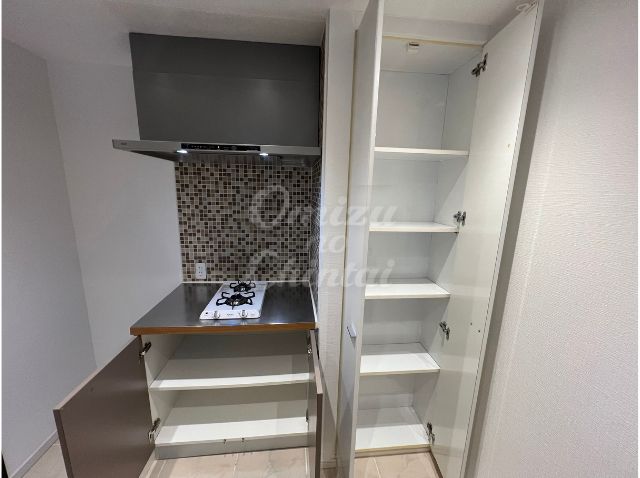スタイリッシュな二口のガスコンロは、一人暮らしや二人暮らしにちょうどいいサイズ感。