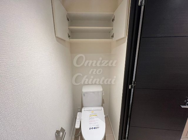 トイレ上部には、壁面に溶け込むホワイトの吊戸棚を設置。