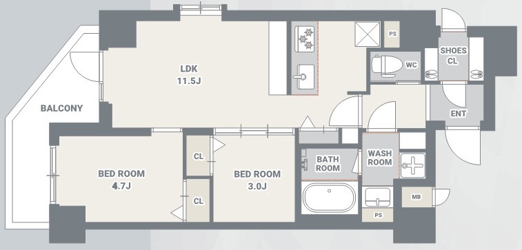 角部屋ならではの2面採光から差し込む光が、ホワイトフローリングに反射してお部屋全体を明るく包み込みます。