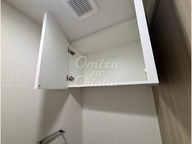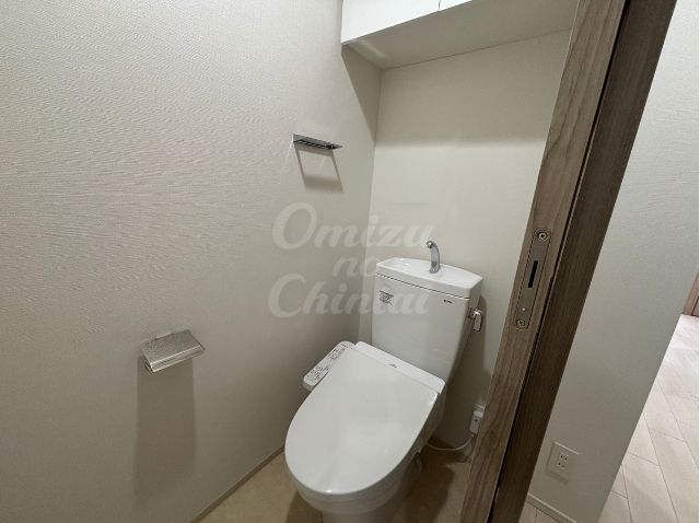 トイレ上部には、トイレットペーパーのストックやサニタリー用品を隠して収納できる棚を完備。