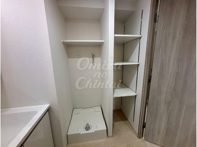 洗濯機置き場から収納棚まで、すべてホワイトで統一され、すぐ横には高さ調節が可能な可動棚が設置されています。