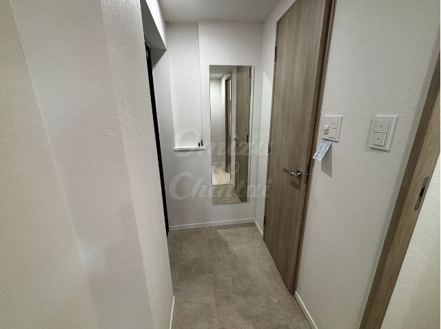 玄関には、大人女子に必須アイテムの大きな全身鏡と、さりげなく横に配置されたニッチ棚には、お気に入りの香水やルームフレグランスや鍵を置くトレイを置いてお洒落な空間を演出。