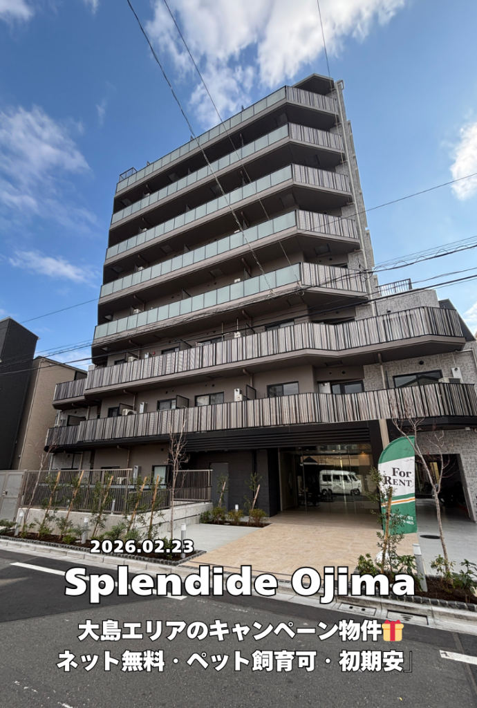 スプランディッド大島は、東京都江東区大島8丁目に2025年7月に誕生した新築物件で、スタイリッシュな外観デザインとインターネット無料、ペット飼育もご相談可能な物件です。